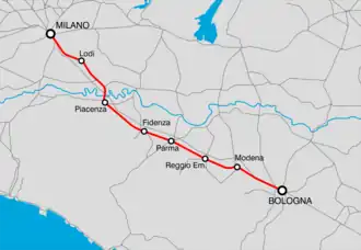 After Piacenza the railway runs parallel to the Via Emilia (state highway 9) passing through Pontenure, Cadeo, Fiorenzuola d'Arda and Alseno. It enters the territory of Province of Parma, at Fidenza, where lines branch off to Cremona, Fornovo and Salsomaggiore Terme and there is an interconnection with the high-speed line.[18] The next station, Castelguelfo has a freight yard. The line arrives at Parma where lines branch off to La Spezia, Brescia and Suzzara, while to the east of the city, there is another interconnection with the high-speed line.[18] The line enters the Province of Reggio Emilia, which is the location of the stations of Sant'Ilario d'Enza, Reggio Emilia (the terminus of the three lines of the Ferrovie Reggiane) and Rubiera. The line enters the Province of Modena, where the lines to Mantua and Modena, and Sassuolo branch off in Modena station.