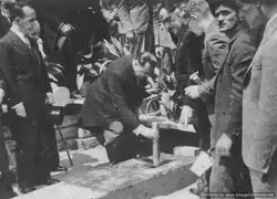 The attempted Concordat with the Holy See caused severe protests from the Serbian Orthodox Church in 1937 and thus never came into effect.[11] When the Concordat came up for ratification by the skupshtina on 23 July 1937, protests broke out overnight in Belgrade by Orthodox priests who called the concordat a sell-out to the Roman Catholic Church.[11] The very night that the parliament was holding the vote to ratify the Concordat, the Patriarch Varnava of the Serbian Orthodox Church died, which Orthodox faithful saw as a sign that God disapproved of the Concordat.[10] That the Patriarch died the same night caused an immense backlash against the Concordat among the Serbs, and the Orthodox Church announced that all Orthodox deputies in the skupshtina who voted for the Concordat were now penalised.[10] Stojadinović withdrew the Concordat in a bid to save his popularity with the Serbs, damaging his own reputation among Croats as a fair-minded negotiator and prompting Maček to accuse him of dealing in bad faith.[10] Thus, the failed Concordat cost Stojadinović popular support in both Croatia and Serbia.[10] In October 1937, Maček signed an accord called the Bloc of National Agreement which brought together his own Croatian Peasant Party with the anti-Stojadinović faction of the Serb Radicals, the Democrats, the Agrarian Party and the Independent Democrats.[36] By this time, despite the economic upturn, Stojadinović was widely unpopular owing to rampant corruption within his government.[37] British novelist Rebecca West who went to Yugoslavia in 1937 to research her book Black Lamb and Grey Falcon reported that ordinary people had told her that Stojadinović was "a tyrant and enemy of freedom" who was "hated throughout the length and breadth of the land" amidst rumors that Stojadinović and his associates were looting the public treasury.[37] In December 1937, Stojadinović visited Rome to meet Benito Mussolini and his son-in-law, the Foreign Minister, Count Galeazzo Ciano, both of whom he regarded as friends.[38] Ciano wrote in his diary that Stojadinović: "...liked the Mussolini formula: strength and consensus. King Alexander had only strength. S[tojadinović] wants to popularize his dictatorship".[39] Ciano reciprocated Stojadinović's admiration of Fascist Italy, writing in his diary he is "our sincere friend... a strong, full-blooded man with a resonant laugh and a strong handshake... a man who inspires confidence... Of all the political men I have encountered so far in my European wanderings, he is the one I find the most interesting".[39] Although Stojadinović brought along his wife, Ciano arranged parties "with the most beautiful women of Rome society", knowing that Stojadinović was a womanizer who took many of the Roman beauties he met to his bed.[39]