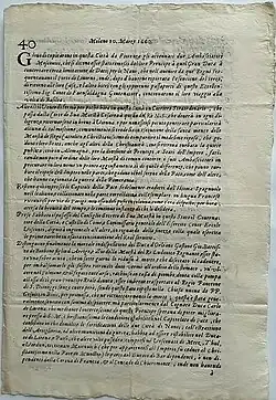 Since 1640 the typographer was surely the Malatesta family who continued to publish it for all the life of the newspaper.[2] The Malatestas were the official printer of the government in Duchy of Milan, having the monopoly of the official publications. They succeeded to pass this privilege for many generations, from Panfolfo (fl. 1594—1626) to Giulio Cesare (fl. 1635—1664), Giovanni Battista (fl. 1635—1654), Marc'Antonio Pandolfo (fl. 1664—1715) who in January 1672 started to print his name in the last page of the newspaper, and finally his nephew, Giuseppe Richini Malatesta (born in 1694 and died in 1793).[2] Due to their privilege of publishing, the Malatestas were like the voice of the Government.[3]