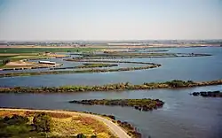 An aerial photo of Mildred Island taken from the southwest, with Bacon Island to the left, and Mandeville Island in the background.