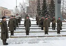 It was founded in November 1960 by Major Evgeny Matyushkin, who served as its first director and invested a lot of effort in the formation and popularization of the band. He later became a professor at the Urals Mussorgsky State Conservatoire and was conferred the title of Honoured Cultural Worker of the RSFSR. Notable soloists that have performed with the band have included: Svetlana Komaricheva, Yury Yakovlev, Yuri Devin, and Sergei Belov. On 3 March 2011, the band celebrated its golden jubilee in the local House of Officers.[2] The band has participated in festivals in Budapest, Almaty, Tyumen, Surgut, and Khabarovsk. In 2011, the band took part in the 20th International Brass Band Festival in Chiayi (Taiwan) and the WASBE World Congress. It regularly takes part in Russian national events such as Victory Day and Defender of the Fatherland Day.[3][4][5] It has also taken part in Russian Orthodox prayer processions from the City's Holy Trinity Cathedral.[6]