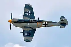 An Hispano Aviación HA-1112 marked as a Messerschmitt Bf 109 showing the standard German crosses worn during World War II.