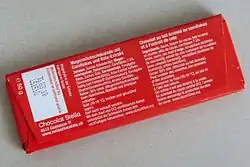 The military chocolate had the official designation "emergency rations" (Notportion, ration de secours, razione di soccorso or raziun da reserva) in the Swiss army.[1] It was dark chocolate packed in two white cardboard boxes, which were covered with a transparent plastic film. They were about the size of a cigarette box. The two cardboard boxes were connected but could easily be separated by a perforation. This military chocolate was produced by several companies, such as Villars-Maitre-Chocolatier and Chocolat Stella. For decades the military chocolate has been part of the basic rations for Swiss soldiers. In addition to the military biscuit, it is popular for schoolchildren who receive them from soldiers. The military chocolate thus achieved a certain cult status.