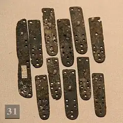 Brigandine armour was used during the Ming era and consisted of riveted plates covered with fabric.[78]
