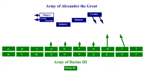 Alexander the Great had an army of 47,000 men, which was small compared to those of Darius—who according to modern historians assembled between 50,000 and 120,000 soldiers, maximum figure due to supply problems. The "hammer" and "anvil" tactics, which were the key to Alexander's victories until then, could no longer lead to victory, for it was indeed impossible to surround the entire Persian army.
