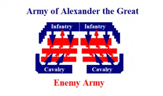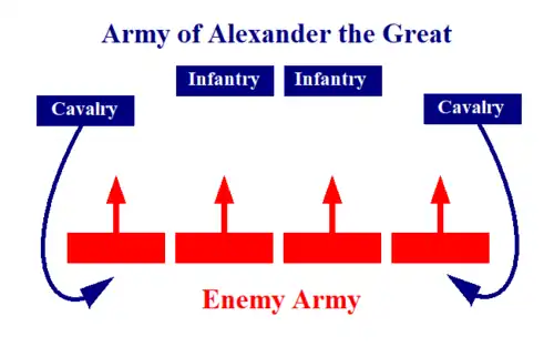 Attacking from the flanks, the Macedonian cavalry surprised the enemy troops by the speed and force of its impact; in the center, the phalanx and the hypaspists advanced to open the second front. Once the enemy's way was closed, it was left in a trap. Generally, this caused great confusion because it could not be distinguished whether the units were dispersed or just poorly coordinated.