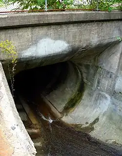 The Mill Creek Tube is a 22-foot (6.7 m) wide, 19-foot (5.8 m) tall, and 12,280-foot (3,740 m) long, reinforced concrete tube that carries Mill Creek under the city of Erie.[12] Built to prevent another catastrophic flood similar to the one in 1915, the tube was completed in 1923. It begins on the southern side of West 30th Street and terminates on the northern side of the Bayfront Parkway. The tube contains over 70,000 barrels, or 13,600 short tons (12,300 t), of cement and drops 200 feet (61 m) over its total length.[12]