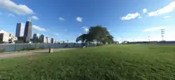 ![]() Open space at Milton Lee Olive Park, with a view of the Chicago skyline along Lake Michigan | |