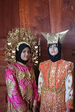 Malaysian girls in traditional Minangkabau attire at the Istano Silinduang Bulan, Tanah Datar Regency, West Sumatra, Indonesia.
