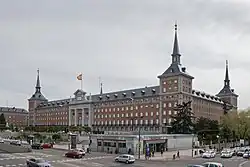 After the end of the Civil War, Yagüe intended to build a new Air Force out of the Aviación Nacional with the help of Nazi Germany and Fascist Italy, and with the clear intention of participating in World War II on the side of the Axis powers.[4] At the beginning of World War II the new Air Force had 14 regiments and 3 groups,[5] composed in turn by 172 fighters and 164 bombers of different types, along with 82 assisting planes and 75 other devices of different types captured from the Spanish Republican Air Force.[6] The reports issued by the General Staff, however, left in evidence the bad state in which the airplanes were, the lack of spare parts and fuel.[7] In the end, the project to expand the Air Force was a failure given the situation in the country, and Yagüe was dismissed and replaced by General Juan Vigón.[4] Since 1940, different locations in Madrid were searched for the future headquarters of the Ministry, and after several options a site in the district of Moncloa-Aravaca was chosen. The lots are acquired by the City Council of Madrid, under then Mayor of Madrid Alberto Alcocer y Ribacoba; General Vigón instructed architect Luis Gutiérrez Soto on the renovation of the area and the design of the new building. Although the building was not completed until 1958, it was already fulfilling its mission in 1954.