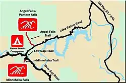 The falls can be reached by a short trail (0.4 miles) from Bear Gap Road called the Minnehaha Trail. The trail is maintained by the U.S. Forest Service.