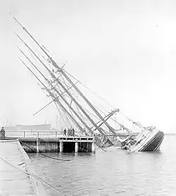 During one of the voyages from Washington state to San Francisco in November 1906, the Minnie A. Caine saved the crew of another San Franciscan schooner, the Emma Caudina, which was wrecked off Grays Harbor.[57][58] Three years later, on December 27, 1909, the Minnie A. Caine itself reached Grays Harbor in miserable condition after encountering a typhoon. The schooner was sailing from Haiphong, French Indochina, to Bellingham, Washington, and the typhoon carried away all her sails and destroyed most of her provisions.[59] The crew was suffering from severe hunger. Captain J.K. Olsen became stricken with heart disease, and on arrival was taken to the Hoquiam hospital in critical condition.[59] G. Nelson became the Minnie A. Caine's new captain.[60]