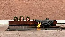 The idea of the program was suggested by Irana Kazakova. Other people of the team who produced the first version were Ekaterina Tarkhanova, Svetlana Volodina, Arkadi Revenko, Mesyatsev, Khazanov, Levitskaya, and other people assistants, artists, musical editors, etc.[1] At the suggestion of the director of the All-Union Radio, The shooting of the television version for the first two years was carried out in the pavilion of the Ostankino television centre, where the scenery of a fire burning in a plaster bowl against the background of a built wall was built. After the construction of the Eternal Flame at the Tomb of the Unknown Soldier, filming began to take place there. The musical compositions that sounded in the background were also selected by Tarkhanova. The program was started with the call signal of Radio Moscow and the announcement by the Soviet radio voice Yuri Levitan, famous for his announcements during the Second World War.[2] The address was initially narrated by well-known Soviet radio commenter and actress Vera Enyutina to a choral version of Träumerei by Schumann in the background, followed by a piece from Symphony No. 6 by Tchaikovsky. The very "minute of silence" was sounded with the toll of the Moscow Kremlin bells and the clock at the Spasskaya Tower striking seven in the evening. The TV version was showing the flame on the background of a wall with the text "To the Memory of the Fallen." The program ended with pieces from Piano Concerto No. 2 by Rachmaninoff, Toccata, Adagio and Fugue in C major (BWV 564) by Bach, and Symphony No. 3 by Scriabin.[3][4] Due to its solemnity the address was informally known as "the prayer".[1]