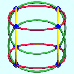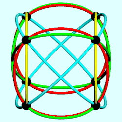 A different (83 64) can be found as with 6 central circles on a cube. The circles are on the 6 mirror planes of tetrahedral symmetry. In full it has 384 automorphisms of hyperoctahedral symmetry as the maximal geometric symmetry can be seen in 6, C(4,2), orthogonal circles as central squares in a 16-cell.