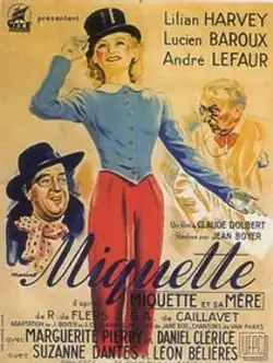 Miquette is a 1940 French comedy film directed by Jean Boyer and starring Lilian Harvey, Lucien Baroux and André Lefaur. It was one of two films made in France by the Anglo-German star Harvey, after emigrating from Nazi Germany.[1] It was her final film appearance, although she continued to act on stage.[2]
