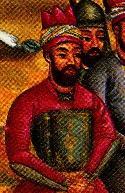 Picture showing Mirza Mehdi Khan in pink clothes holding a book, with Nader Shah Afshar on horseback; at the Battle of Kirkuk with the corpse of the Ottoman general Topal Osman Pasha laid before the Shah (zoomed out).