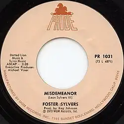 "Misdemeanor" is a song performed by American rhythm and blues singer Foster Sylvers; issued as the first single from his eponymous debut studio album. Written by his brother Leon,[1] the song is his only hit to date on the Billboard Hot 100, peaking at #22 on the chart in 1973.[2]