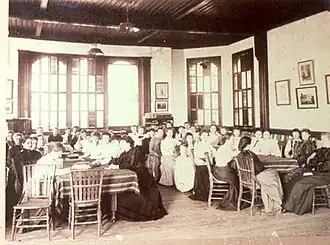 Miss Dana ensured that the "entire school met weekly to discuss current events, and the senior year focused on such themes as exploitation in the slums, reports of muckrakers, and the growth of the Socialist party."[2] She wanted her students to create a forum around contemporary social and political topics. Her philosophy was "intellectual and moral."[1][2][3]