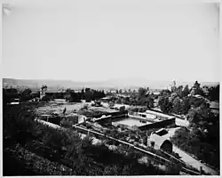 In 1806, a square stone reservoir was constructed as part of an irrigation system providing water for the Mission's orchards and gardens.[14] Originally measuring 7 ft (2.13 m) deep with an area of 110 ft2, the reservoir was capable of holding some 535,000 gallons of water.[12] Located north of Almeda Padre Serra within Mission Park, this reservoir was well-crafted enough to be utilized by the city for water storage until 1993. It was hence transferred from the Public Works Department to the Parks Department to serve as part of Mission Historical Park.[15]