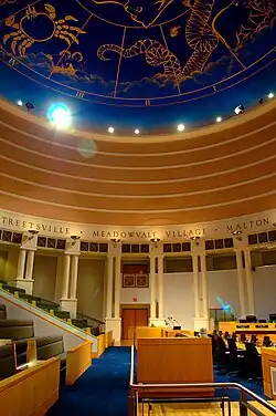 The Mississauga Civic Centre is the seat of local government of Mississauga, Ontario, Canada. The 37,280 square metre complex is a prominent example of postmodern architecture in Canada, finished in 1987 by Jones and Kirkland. It stands at 92 metres or 302 feet. The design was influenced by farmsteads which once occupied much of Mississauga[1] as well as historical features of city centres. The building, for instance, includes a prominent clock tower. It was chosen as the winner of a design competition that included 246 submissions. Mississauga Civic Centre is located in the City Centre near Square One Shopping Centre and is home to the Mississauga City Council. The civic center building is considered one of the most iconic and recognizable buildings and cultural icons of the city of Mississauga.[2]