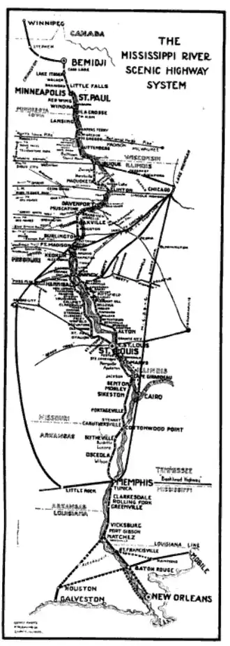 3. ^ a b c Vant Hul, J.C. Jr. (July–August 1920). "The Mississippi River Scenic Highway". See America First. Vol. 6, no. 5. pp. 60, 70 – via Google Books.
