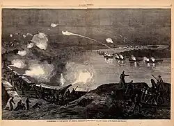 The Confederates had fortified a tight double-bend in the river, with garrisons at New Madrid, Missouri, and Island Number Ten. Union Major-General John Pope arrived unexpectedly, before winter was over, easily took New Madrid, and then ordered two gunboats to run the island batteries, covering his crossing to the east (Tennessee) bank, whereupon the outnumbered enemy surrendered.[13]