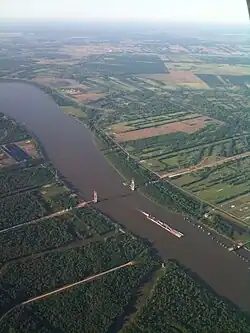 Aerial photo of the river boundary between regions 73k (bottom left) and 74c (top right) near St. Francisville.