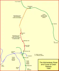 The Mitcheldean Road and Forest of Dean Junction Railway was an independent railway company incorporated in 1871, to provide a northerly outlet for iron ore and coal products from the Cinderford and Whimsey area in the Forest of Dean, to the Hereford, Ross and Gloucester Railway line; mineral traffic to industrial centres in South Wales and the Midlands was foreseen.