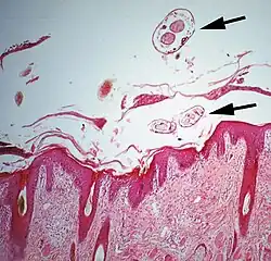 Sarcoptic mites as adults are microscopic, nearly circular in outline, and their legs are short, adapted for burrowing.[30] The females, after mating with males on the surface of their host's skin, burrow into the living layers of the epidermis (mainly the stratum spinosum). They make tunnels horizontal to the surface of the skin. Here, eggs are laid and development of larvae and nymphs occurs. The mites have low mobility and transmission between hosts occurs only during close contact.[31] The feeding of the mites and their excretory products irritates and inflames the skin, causing intense pruritus. Dermal hypersensitivity reactions develop in the host. Chronic infestations lead to thickening of the skin by overproduction of epidermal cells (acanthosis), resulting in a characteristic depilated and scaly appearance. Stress caused by the pruritus can be severe, and will result in 6% to 23% lost productivity of commercially reared pigs.[32][33] Camels are prone to severe infestation with Sarcoptes.[34]