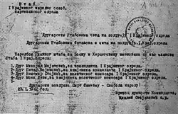 The third counter-insurgency operation in Kozara was undertaken at the end of November 1941 by about 19,000 Croatian Home Guards, Ustaše, and Germans.[66] The Partisans emerged from the operation without significant losses, though NDH propaganda claimed that the rebels in Kozara were destroyed and that Stojanović had been killed.[67] The Kozara Partisans never repeated the mistake of frontal resistance.[63] When stronger enemy forces advanced toward them, they manoeuvred to position themselves behind the attackers, thus avoiding battles they could not win. The Partisans therefore did not defend villages. During the third counter-insurgency operation, the Ustaše and Germans killed hundreds of Serb civilians in the villages, resulting in a loss of support for the Partisans among the population. Stojanović thought that a significant victory over the enemy would be the best way to restore the lost support.[67]
