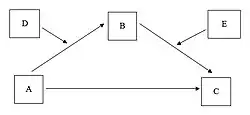 In addition to the three manners proposed by Muller and colleagues in which moderated mediation can occur, Preacher, Rucker, and Hayes (2007) proposed that the independent variable A itself can moderate the effect of the mediator B on the outcome variable C. They also proposed that a moderator variable D could moderate the effect of A on B, while a different moderator E moderates the effect of B on C.[1]