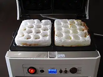A moffle is a Japanese dish consisting of mochi rice cake cooked in a waffle iron, which creates a waffle.[1][2] A typical cooked moffle has a crunchy exterior with a thin interior layer of glutinous mochi.[3] When prepared as a dessert, it is typically served with various condiments.[1][2] It is also prepared as a snack food using ingredients such as ham and cheese or cod roe.[4]