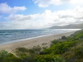 The beach at Moggs Creek, unlike that at Aireys Inlet, is a long, uninterrupted sandy beach, running between Fairhaven in the east and Eastern View in the west. The shore is lined with sand dunes, covered in shrubbery, which separate the beach from the Great Ocean Road. Though that stretch of beach is usually wide and easily traversable, water can rise close to the dunes at high tide.
