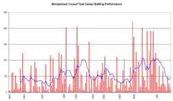 An innings-by-innings breakdown of Yousuf's Test match batting career as of 16 December 2007, showing runs scored (red bars) and the average of the last ten innings (blue line).