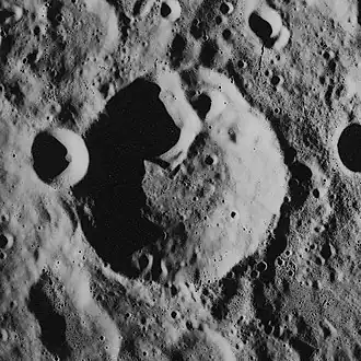 Mohorovičić is a lunar impact crater that is located on the far side of the Moon. It lies to the southwest of the larger crater Doppler and the huge walled plain Korolev. To the southwest of Mohorovičić is a small lunar mare that has been named Lacus Oblivionis. Due south of it is an unnamed mountain that formed during the impact that created the South Pole-Aitken Basin.