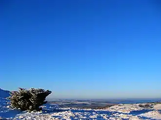 Jernhatten (English: The Iron Hat) is a view point on the coast of the Kattegat sea, in the eastern parts of the park. The cliff above the sea has a drop of 49 metres (161 ft). The formation is very hard and not erodible by sea waves. From the car parking area, the site is approached along a track passing through the beechwood of Troldeskoven (English: The Troll Forest). The hill offers panoramic views of the surrounding area and across the Kattegat sea with the small island of Hjelm in the southeast. The path to Jernhatten leads onwards to the hills of Hyllested Bjerge, the forest of Bagskoven and down to the beach. The seafloor along the coast here, comprise a cold water stony reef with an extensive kelp forest known as the Blak, offering good snorkeling opportunities in the summer months.[5] Harbour porpoises may be visible as well.[12][13]