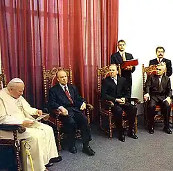 Momčilo Krajišnik (Serbian Cyrillic: Момчило Крајишник; 20 January 1945 – 15 September 2020) was a Bosnian Serb political leader and convicted war criminal, who along with Radovan Karadžić co-founded the Bosnian Serb nationalist Serb Democratic Party (SDS).[1] Between 1990 and 1992, he was speaker of the People's Assembly of Republika Srpska. Between June and December 1992, Krajišnik also served as a member of the expanded Presidency of Republika Srpska. After the Bosnian War, he was elected Serb member of the tripartite Presidency of Bosnia and Herzegovina in the September 1996 election and served in that post from October 1996 until October 1998. He lost his bid for re-election in 1998 to Živko Radišić.