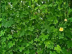 It is a climbing annual to perennial herb up to 5 meters long. Its stem is thin, angular and slightly hairy. The alternately arranged leaves are divided into petiole and leaf blade. The hairy petiole is short. The soft, thin leaf blade is up to 12 centimeters in size, heart-shaped and broadly ovate to rounded in outline. The sparsely hairy leaf blade is palmately divided and five to seven lobes and the leaf lobes are each multiply lobed or remotely sharp-toothed. The leaf margins are entire and often pointed on the lobe tips or teeth. The thin tendrils are simple and long.