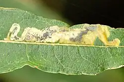 The oval eggs are laid on the surface of leaves, usually near the midrib. Larvae are yellow with a brown head and have a thoracic plate and an anal plate. They mine the leaves of rosebay willowherb (Epilobium angustifolium) causing a yellowish blotch on the leaves that bleach rapidly after the larvae leave them. The caterpillars occur in May to late July and late August to September They overwinter as a pupa and pupation occurs among detritus on the ground.[5][6]