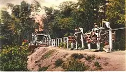 Monorails in Central Java were used to transport timber from the forests of Central Java located in the mountains to the rivers. In 1908 and 1909, the forester H. J. L. Beck built a manually operated monorail of limited but sufficient capacity for the transport of small timber and firewood in the Northern Surabaya forest district. In later years, this idea was further developed by L. A. van de Ven, who was a forester in the Grobogan forest district around 1908–1910.[65][66] Monorails were built by plantation operators and wood processing companies throughout the mountains of Central Java.[67] In 1919/1920, however, the hand-operated monorails gradually disappeared and were replaced by narrow-gauge railways with steam locomotives as forest utilization changed.[68]