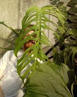 Monstera 'Esqueleto' is a robust nomadic vine (frequently still erroneously referred to as a hemiepiphyte[3]) comparable in many aspects of its morphology to Monstera lechleriana. Its growth habit, enormous size and tight internodal spacing at maturity, with leaf bases densely stacked in two rows like Ravenala are characteristic of the M. lechleriana species complex. For this reason, it can be referred to as Monstera sp. aff. lechleriana 'Esqueleto', however the cultivar name makes everything else after the genus redundant. In comparison with M. lechleriana and other undescribed varieties within the complex, M. 'Esqueleto' has leaf blades which are more intensely perforate, with small perforations near the midrib and larger ones extending towards the leaf margin, reminiscent of some morphotypes of M. adansonii ssp. laniata but on a larger scale and often with a noticeable droop. The leaf blades can be over a metre in length in a mature plant. The petioles have a persistent sheath which stays green for at least the majority of the life of the leaf itself. Its wings tend to be broad and held open, somewhat squared off at the top and seldom reach near the geniculum. The inflorescence has a very long spathe, internally cream-coloured and externally off-white blending to green at the bottom.[4]