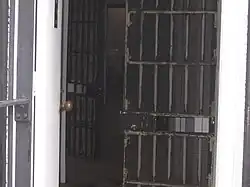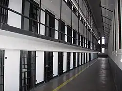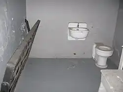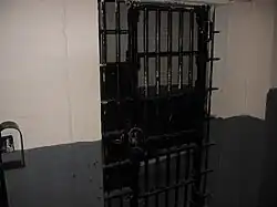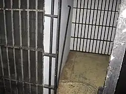 In 1896, Conley deemed the old Territorial Penitentiary insufficient, even after remodeling it to house 164 inmates, so he constructed the first of two cellblocks. The 1896 Cellblock bordered the Territorial building on its southern side and could house 256 inmates in four tiers of thirty-two cells, each measuring 6 ft (1.8 m) long, 8 ft (2.4 m) deep, and 7 ft 4 in (2.24 m) tall.[20] None of these cells had plumbing, however, and inmates again used the bucket system: one for fresh water, the other for human waste.[21] Each door locked individually, which, when combined with the wood stoves which heated the building and the wooden roof, created a safety hazard in the case of a fire. Electricity didn't enter the building until after the start of the 20th century, but this building was a marked improvement from the antiquated Territorial building.