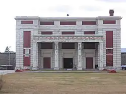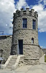 In response to rampant lawlessness and the vigilante-style form of justice present in the newly formed Montana Territory, in 1867 the US Congress allotted $40,000 to Montana for the express purpose of constructing a territorial prison.[4] On 19 November 1867, the territorial government chose Deer Lodge as the site of the facility, and on 2 June 1870, the cornerstone was laid.[5] The original plans for the building called for a structure which held three tiers of fourteen cells, but due to the difficulty of acquiring materials, the cost to ship those materials, and the expense of hiring labor, the new building would house only one of the three tiers. On 2 July 1871, US Marshal William Wheeler took possession of the first nine prisoners to be incarcerated in the facility.[6]