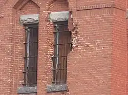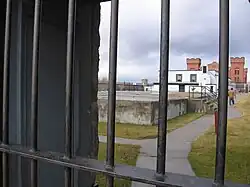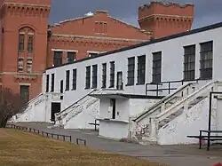 It only took a single month before the prison was overcrowded; by August, six more prisoners had arrived.[7] The burgeoning population was quelled somewhat when, in June 1874, another tier of fourteen cells was constructed, and the civilians of Deer Lodge were calmed when a twelve foot board fence went up in 1875.[8] The prison's population continued to grow, so Congress allocated an additional $15,000 for the construction of another tier of cells, but the soft brick of the building could not support any more weight. Instead, the money went into an administration building with guard barracks, a warden's office, and a visitor's reception.[9] Finally, in 1885, $25,000 served to provide the prison with a three-story cellblock with 42 double-occupancy cells which was completed in 1886.[10] The Montana Territorial Prison was finally completed to original specifications, just in time to be handed over to the new State of Montana in March 1890.[11]