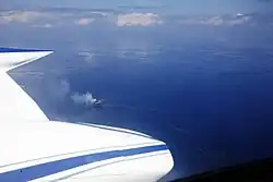 The leak initially emanated from the Montara Wellhead platform on 21 August 2009. The depth of water was approximately 250 ft (76 m) and depth of hole was approximately 1.6 mi (3 km) below the seabed.[23] Sixty-nine workers on the rig were safely evacuated with no injuries or fatalities.[8] By 24 August, the oil slick resulting from the spill was estimated to be 14 km (9 mi) long and 30 m (100 ft) wide.[1] On 29 August, the slick was estimated at 180 km (110 mi) at a minimum, measured east to west.[24]