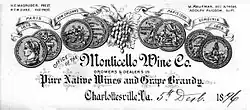 The success of Monticello Wine Company brought Charlottesville to declare itself "the Capital of the Wine Belt in Virginia."[1] The company was best known for its Virginia Claret Wine, produced with Norton grapes—it "won a major international award in 1873 at the Vienna Exposition."[6] It was located in what is now the Monticello American Viticultural Area.[7]