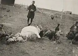 The first family living in Montmartre was that of Auguste M.D. de Trémaudan (the only family who was brought by the Foncier Society) who brought his wife Jeanne Marie and children from France. The second family was that of Mr. Berneau, who brought his wife, 18-year-old son and baby boy (who later died after their arrival in Canada). On June 1, 1893, both families arrived in their new home of Montmartre where they temporarily lived in sod-covered tepee structures.[14] Eventually, as the Society promised, houses were built for colonists in the form of a village. In August 1893, as another fulfillment of the Society's promises, each colonist was assigned a quarter section of land. Later that year, on November 10, 1893, Jeanne Simonin was born, marking the first birth in Montmartre.[15]