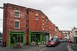 Montpelier occupies a hillside which rises from south to north, overlooking the city centre, with narrow streets that follow the contours. It is densely built with primarily Georgian and Victorian terraced housing, with some modern infill apartment buildings and larger villas.[1]