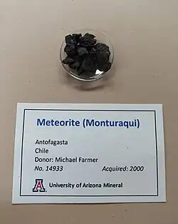 The nonoxidized parts consist of cohenite, rabdite, schreibersite and taenite. Other minerals are goethite, lepidocrocite, maghemite, pentlandite and reevesite.[36][37] Metallic spherules occur.[16] Fragments of the Monturaqui meteorite have been collected in the meteorite collection of "Giorgio Abetti" Astronomical Observatory and Museum, San Giovanni in Persiceto, Bologna, Italy.[38]