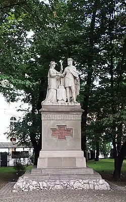 The Jadwiga and Jagiełło Monument (Polish: Pomnik Jadwigi i Jagiełły) is a Gothic monument in Kraków, in the northern part of Planty at Basztowa Street, commemorating the 500th anniversary of the Polish-Lithuanian union. Founded by Tomasz Oskar Sosnowski, it depicts Queen Jadwiga of Poland and Władysław II Jagiełło at the moment of their nuptials. Made of Carrara marble, decorated with the coats of arms of Poland and Lithuania, it was unveiled in 1886. The whole is decorated with a Latin inscription and a plaque commemorating the union of 1386.[1]